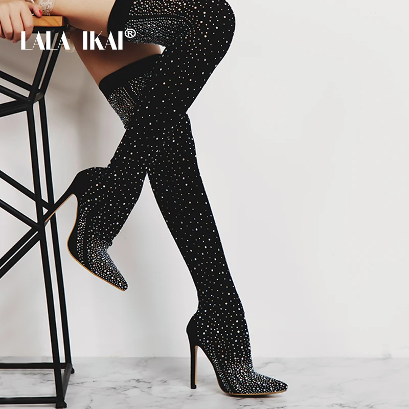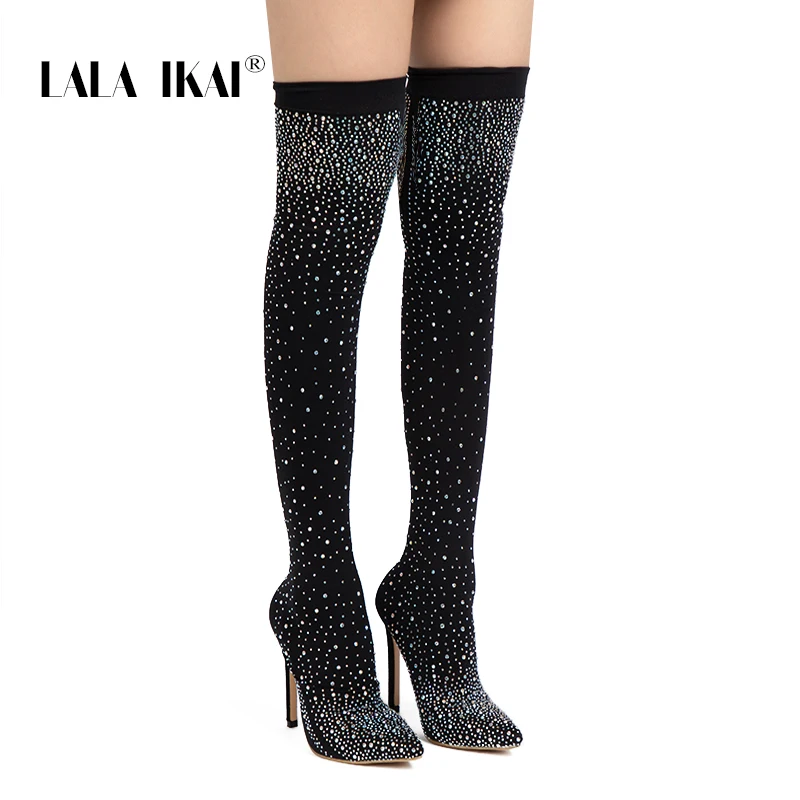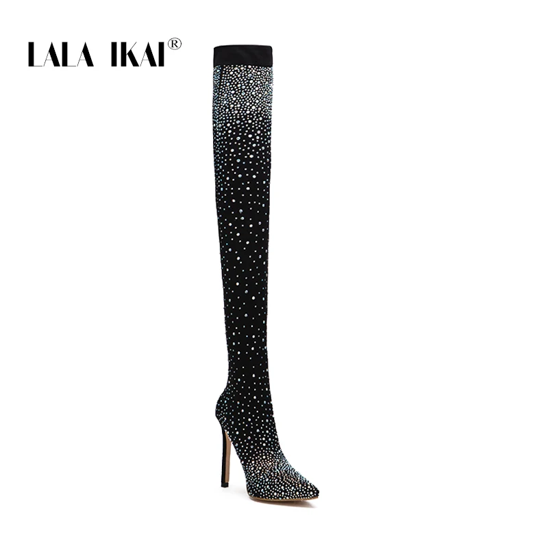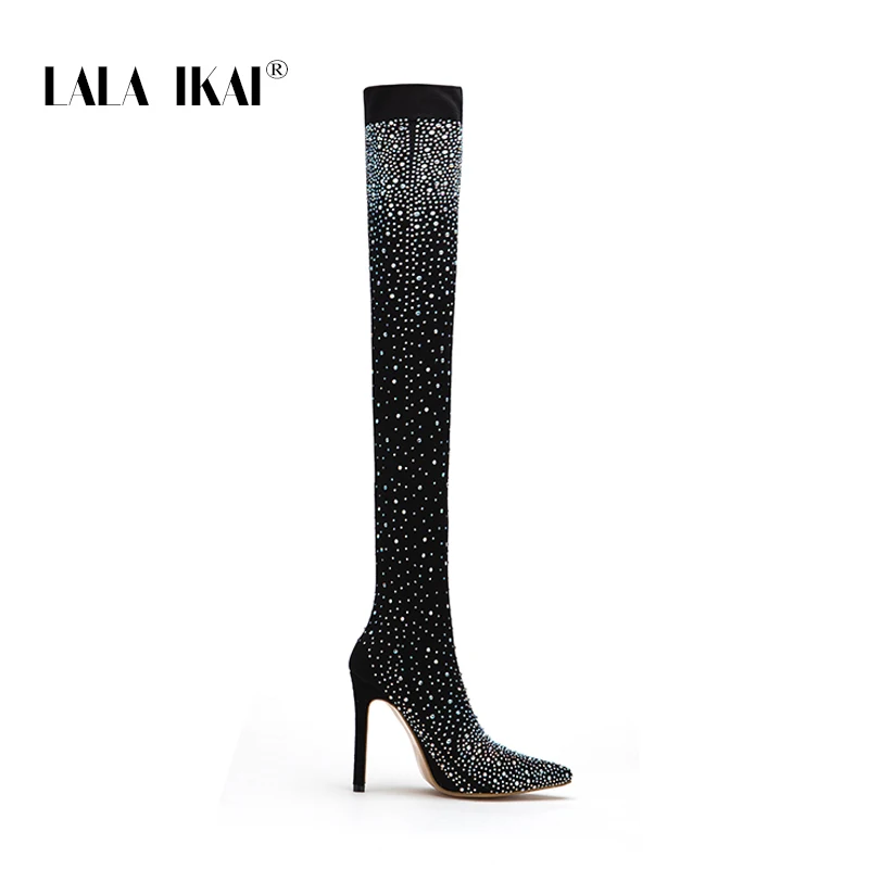 . Comprar LALA IKAI negro de las mujeres de la rodilla de Lycra estiramiento botas de tacón alto puntiagudo dedo del pie Club nocturno Slip On Overknees botas 014C1872 4 Online Baratos.