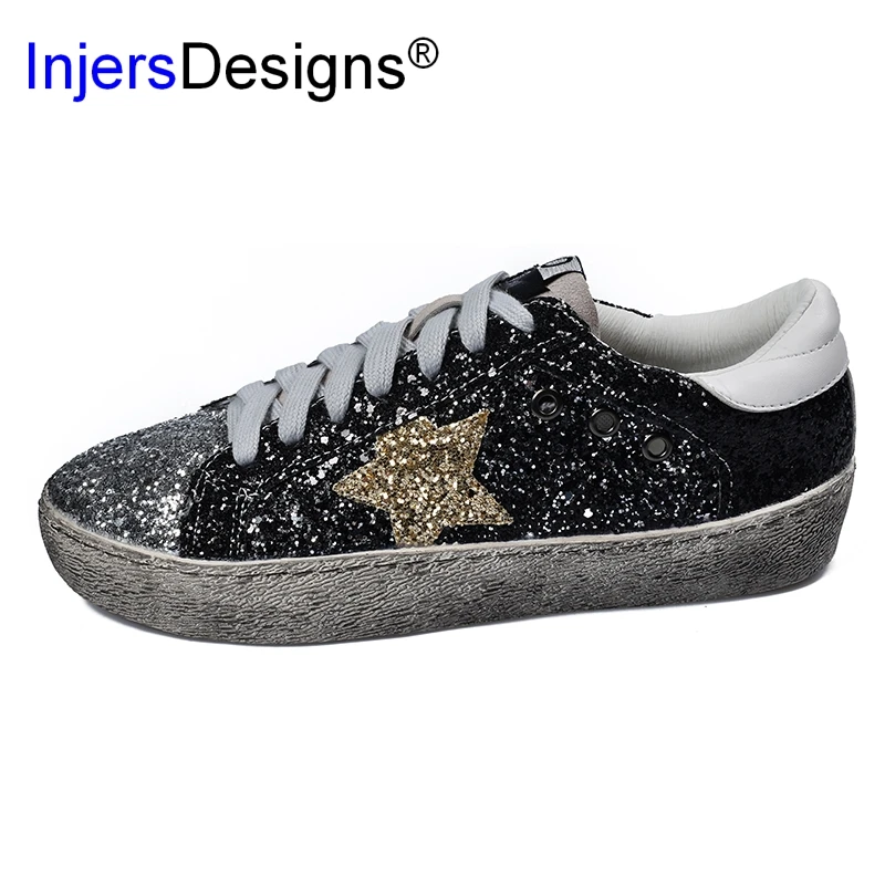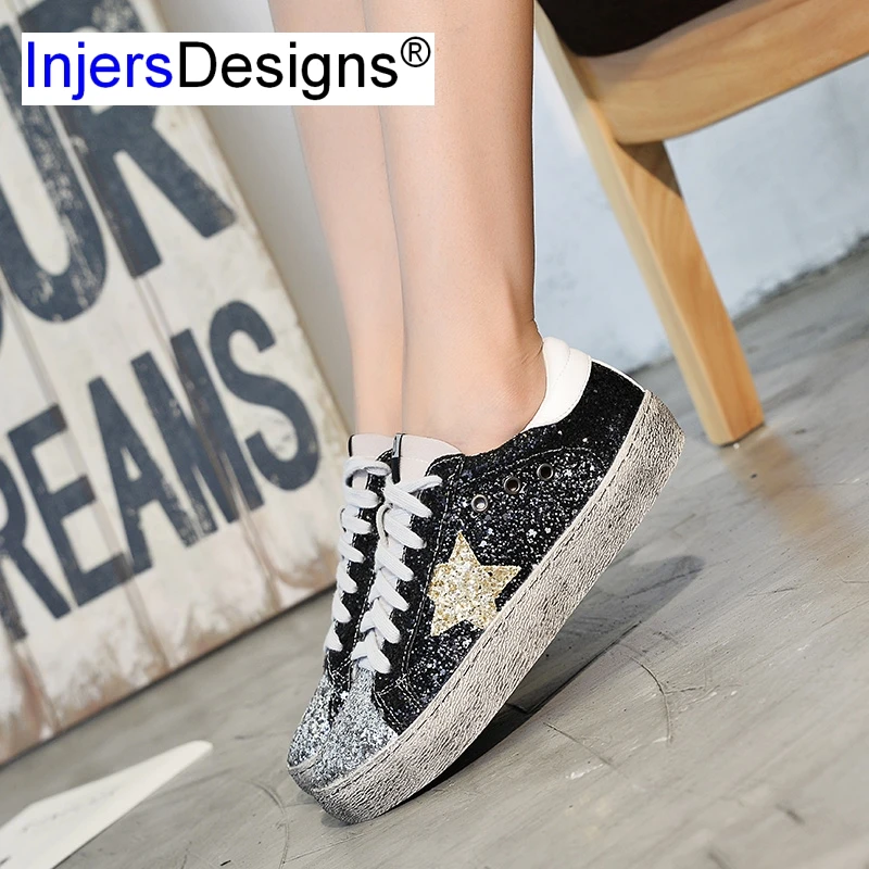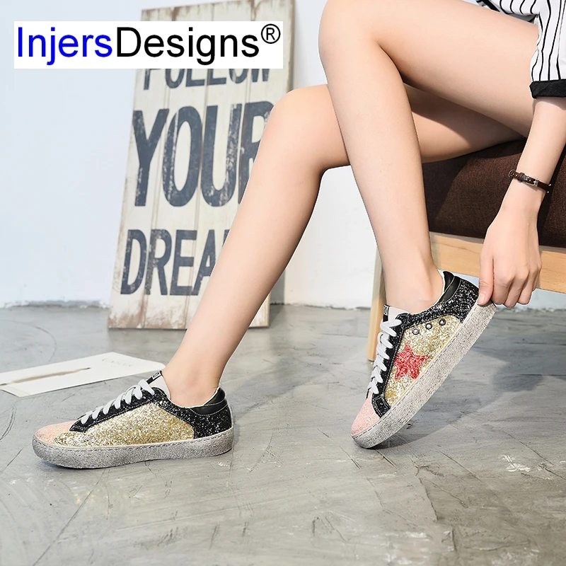 Comprar Zapatos casuales de cuero genuino de mujer zapatos viejos sucios de colores mezclados de moda de lentejuelas doradas de estrellas de ganso Online Baratos