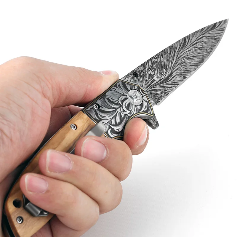 Comprar KKWOLF Caliente Plegable Táctico del Cuchillo Negro 3D patrón Mango de Madera hoja de Campin Caza Al Aire Libre Cuchillo de la Supervivencia Del Cuchillo de Bolsillo Portátil Online Baratos.