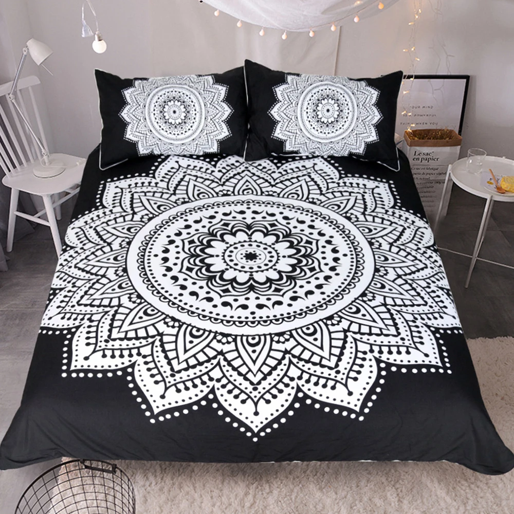 Comprar Conjunto de ropa de cama con estampado de Mandala, tamaño Queen, patrón Floral, funda nórdica, blanco y negro, ropa de cama Bohemia, juego de cama de loto Online Baratos.