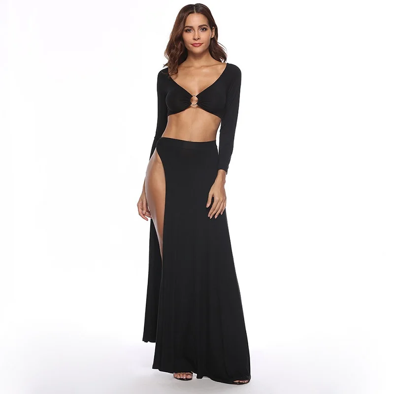 . Comprar Deep v cuello manga larga Otoño Invierno negro Maxi Vestido Mujer 2018 nuevo Sexy Forking dos piezas vestidos De fiesta Vestido De fiesta Online Baratos.