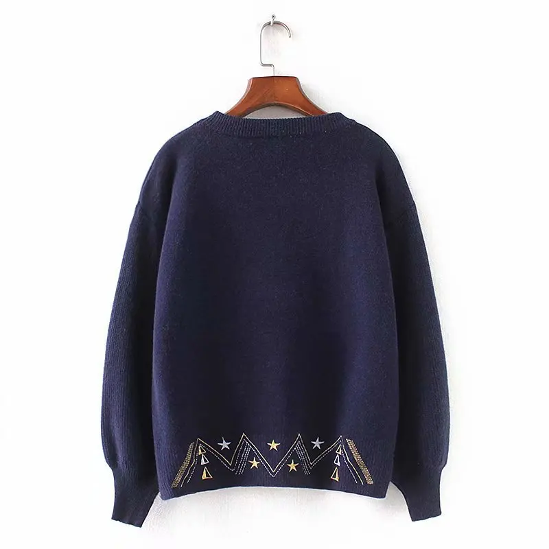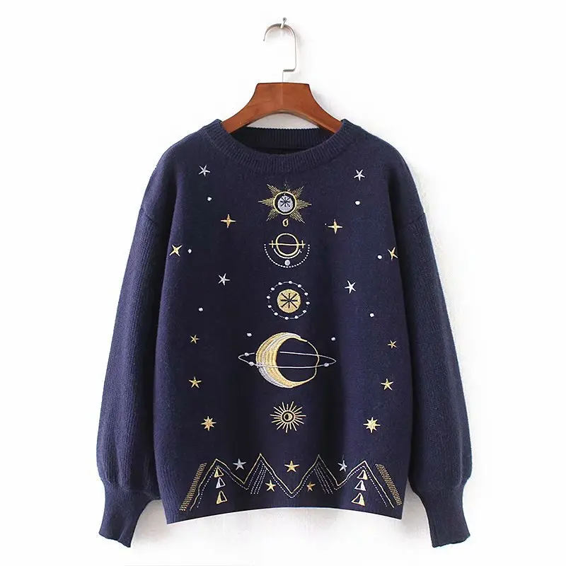 Comprar Suéter de moda para mujer, suéter de punto con bordado de estrella de Luna, cuello redondo, suéter de invierno cálido, suéter Casual para chicas, suéter Online Baratos.