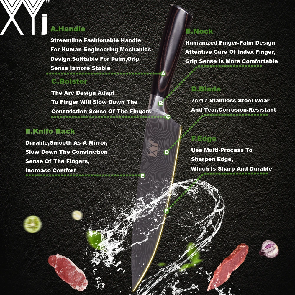 Comprar XYj juego nueva llegada 2018 cocina cuchillos de acero inoxidable herramienta de utilidad fruta Santoku Chef cortadora Damasco venas cuchillos de cocina Online Baratos.