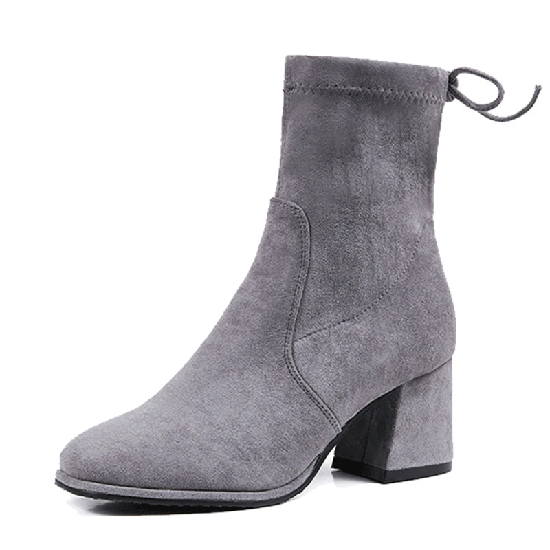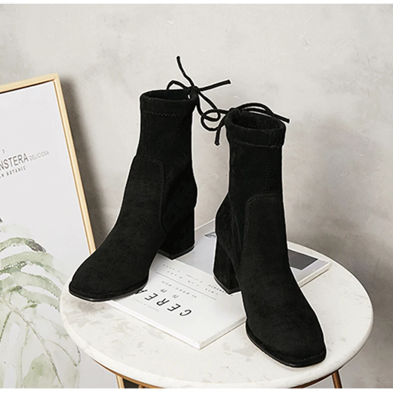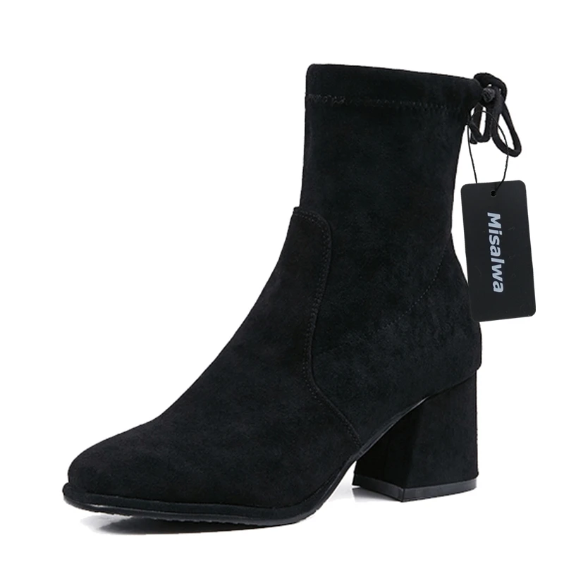 . Comprar Misalwa nueva moda de punta cuadrada mujer Flock botas cortas Sexy tacón grueso tobillo botas de encaje primavera Otoño Invierno zapatos Online Baratos.