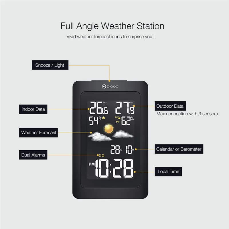 . Comprar Digoo DG TH11300 inalámbrico HD pantalla USB Exterior estación meteorológica VA vidrio higrómetro termómetro pronóstico Sensor reloj Online Baratos.