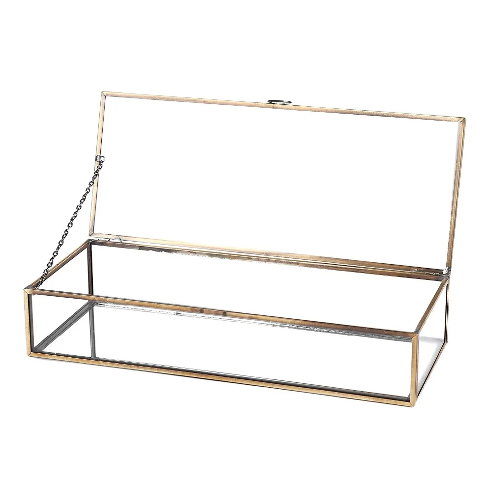 Comprar Caja de sombra con espejo de cristal transparente y Metal de latón de estilo Vintage con tapa superior con bisagras Online Baratos