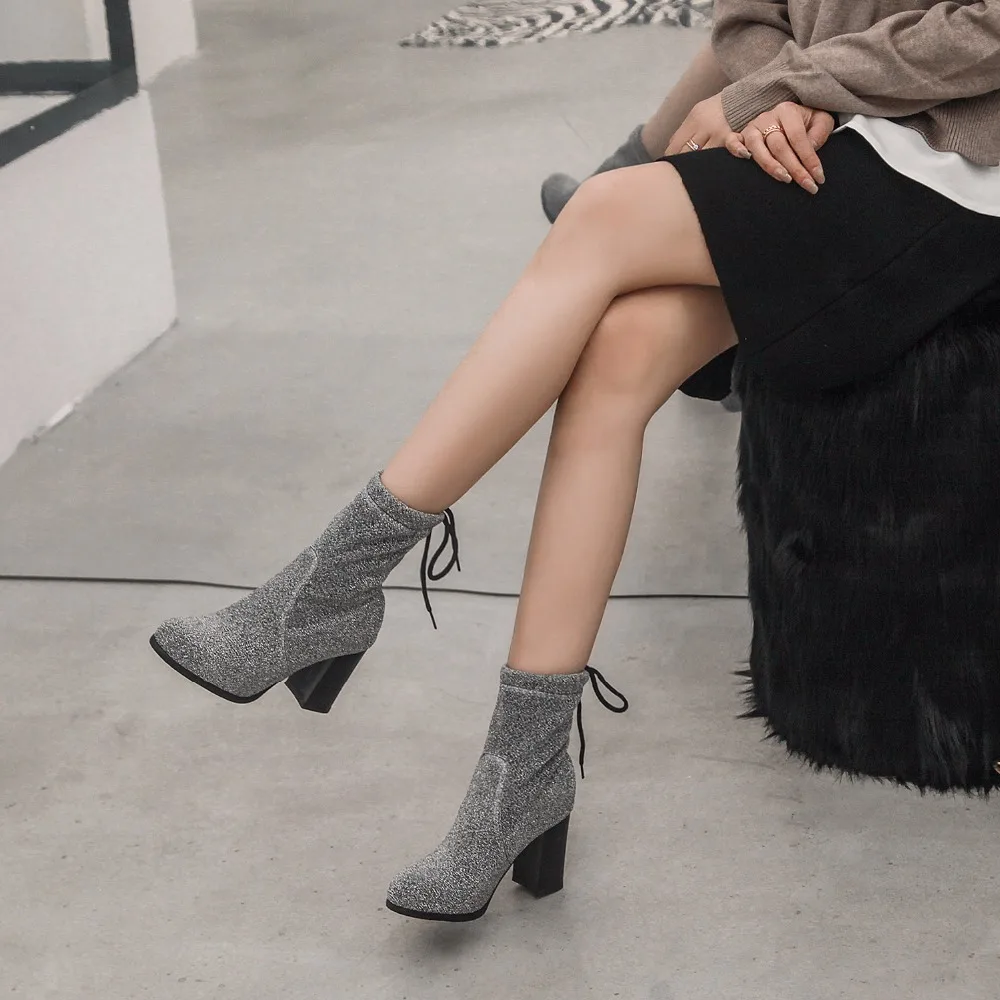 Comprar Otoño Invierno moda mujer botas tacones altos Stretch tela mujeres botines Sexy Bling de punta redonda Martin botas zapatos nuevos femenino Online Baratos