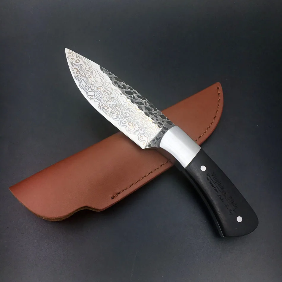 . Comprar 58HRC forjado recta hecha a mano patrón de acero de Damasco cuchillo de caza cuchillo fijo manija del ébano con la envoltura de cuero Online Baratos.