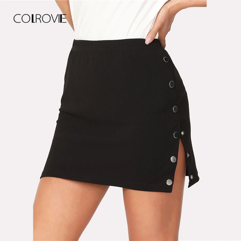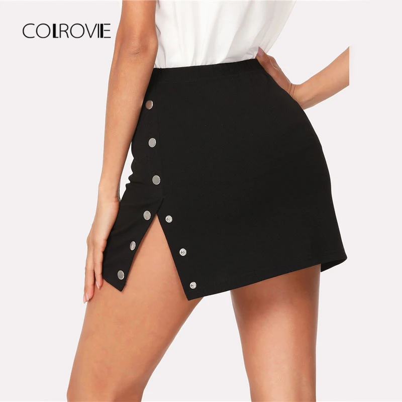. Comprar COLROVIE 2018 nueva falda ajustada lateral abotonada negra de verano corta de verano falda de mujer de verano de cintura media elegante Mini falda lisa Online Baratos.